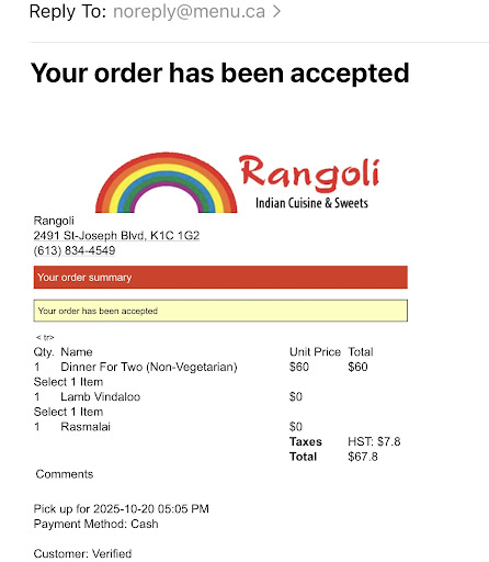 First off, we picked up our food from the restaurant and headed home in the rain only to find out that they packed the wrong dessert in our order. We called the restaurant to see if they could rectify the situation for us and the lady we spoke with was very dismissive of the issue. She told us that they don’t offer rasmalai as a dessert for the Dinner for Two combos and “everybody knows that”. I explained that this was our first time ordering from their restaurant and we were able to select rasmalai as a dessert for our combo - it even specifies this on the receipt we received (see image). Even if it was an error on the website (things happen!), we would have appreciated if they let us know either through a phone call once the order was place or when we picked up our food. She continued to gaslight us about this and ultimately said that they’ll fix their website but “now we know for next time”. In a calm voice, we said there likely wouldn’t be a next time because of their poor customer service, and she said “we don’t tolerate this language over the phone” and hung up the phone! We were shocked at how bad the customer service was.