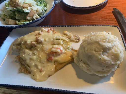 After five or so minutes of looking at the menu, we placed our orders. The biscuits were brought out in short order. We had seafood stuffed mushrooms as an appetizer. Our meals consisted of a small caesar salad, a shrimp entree and we both had the shrimp linguine alfredo for our main course. The entire meal was very tasty, served quickly and hot and the portion sizes were generous. We both took home half our main courses in to go boxes. The price of our meal, including gratuity, was was quite reasonable.