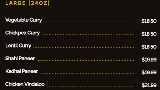 Read moreThis is a hard review to write as we have ordered takeout from Shaan's for years and were big fans of the food there. Over the past couple of years though, we haven't ordered as frequently because we had noticed that one of our favourites - the beef curry - wasn't as good as it was (the delicious chunks of beef got much smaller and less tasty so we stopped ordering it). Our other favourites - the chickpea and the lentil curries were still delicious. However, our latest takeout order will be our last. We know that food costs have risen dramatically so seeing the prices on the menu posted on the website for the large size - which is listed as being 24 oz - was not a surprise. That being said, when I picked up our bag of food, I was surprised at how light it was and when I got home and took the containers out, I was shocked at how small they were. So shocked that I took out our kitchen scale to weigh them. One weighed 9 7/8 oz and the other one tipped the scale at 11 7/8 - not 24 oz! The curries were tasty as always but we definitely felt ripped off. Good bye Shaan's - it was great...