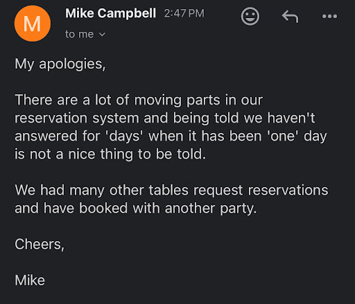 The evening took a complete turn though and we will never return to this place. The server came to see us (right after we had just ordered and received another round of drinks) to inform us that he was turning our table for another reservation in about 10 minutes. We had no idea that the table was being turned and we were disappointed as it felt we were being rushed out and had we known we would not have ordered those last rounds of drinks. Further to this, the server returned promptly 10 minutes later to tell us to leave, however, we weren't even finished our drinks at this point. The way we were spoken to was rudely. We were further frustrated as the next guests had not even arrived yet.