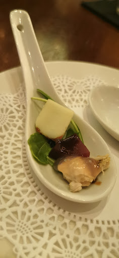 We were greeted by Sasha I believe her name was, very nice and professional. She seated us and gave us a minute or two to figure out what we'd like to drink to start. As we were deciding Sasha came back with these two little delicious and beautifully crafted bites made of pear, chicken, arugula, ,cinnamon and balsamic "pear chicken bite" tasters and they were AMAZING! Sasha explained that the chef's tend to make a rotating daily inspiration dish and today I'd say I got very lucky to have been able to savor these imaginative creations.
