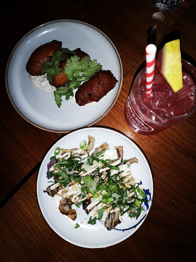 This is a cozy pub-like restaurant that only serves snacky foods. The dishes are designed as sharing plates or samplers. I tried 4 items, coconut prawns, cod cakes, tuna tartar, and brussel sprouts. The tuna was amazing. There's a creamy basil pesto as the base and blue corn chips to dip with. The basil dip has a mouth feel like creamy avocado is in it...but isn't. Additional chips will be required. The prawns come on a bed of rice, and we're delicious; I'd get this again and again. Cooked perfectly so that the shrimp were not at all rubbery. This is like a traditional Thai curry. The brussel sprouts were good but nothing special; but I am a sprout snob. The sprouts at Supply and Demand are much better. I didn't really taste the apple butter. Overall good but could be better if the sprouts were crunchy, or caramelized on one side. The cod cakes was yummy, but the standouts were the prawns and tuna. The other amazing feature is the GIN....so many options. I had a flight of gin, which included 4 types. My friend had a very dirty gin martini and said it was the best she'd ever had. I loved the pepper gin and the lemongrass gin. The atmosphere is quaint and has a British/Scottish pub feel. By 9pm the noise level jumps up to bar level. So if you're going to chat and hangout...get out before 9. Overall, loved this place, and I would highly recommend it. As a side note the staff are amazing and...