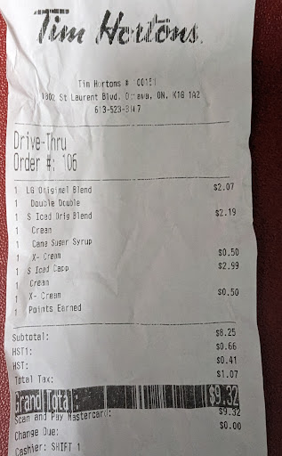 Read moreThis Tim Hortons is so bad I got fed up and walked out. First of all the baked goods section was out of most things and the stuff that was left was displayed haphazardly, broken pieces, and generally looked like stuff the cat dragged in. But the main problem was getting served. I don't know what the woman in front of me ordered that was do complicated but the guy serving her had to keep going over to the drive through and chatting up the cute girl working there but I didn't see him getting her coffees there. No idea what he was doing there. He didn't seem to be in any hurry. Then one if the baking machines starts it's annoying, high pitched beeping sound meaning something is done but nobody would stop the noise (not even the woman working in the back). So I'm waiting.....and waiting......and the beeping us going on....and on....and on....constant beeping over & over as I get more & more angry. The guy still didn't appear even close to finishing the woman's order and then he starts making coffee in the drive through area ( I assume that's the job if the girl who works in that area). There was plenty of coffee in the area up front he was supposed to be working at. Finally I couldn't take it anymore and left. The beeping and the waiting combined were driving me nuts. Can't see ever stepping foot in...