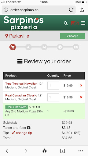 Ā Ā Ā Read more!!!!!Watch your bill people!!!!! Be aware that they will try to double dip on tips on an online order for pickup. They add 15% on your order that you agree to but can change if you actually notice it but most would not. If you order online and click confirm then you pay the total with the tip, then at the store when you use a card they ask for another tip. Some and probably most donāt realize that they are tipping twice! Shady business practices. Pizza is ok, nothing to write a review about. UPDATE: I received a call from the Parksville Sarpino Pizza and apparently they are ok with the way they āMAYā get 2 tips from you and āMOSTā of there customers catch the first tip before coming in to pick up and pay for their pizzas. Well this business is not for me. Good luck in your endeavour Sarpino.