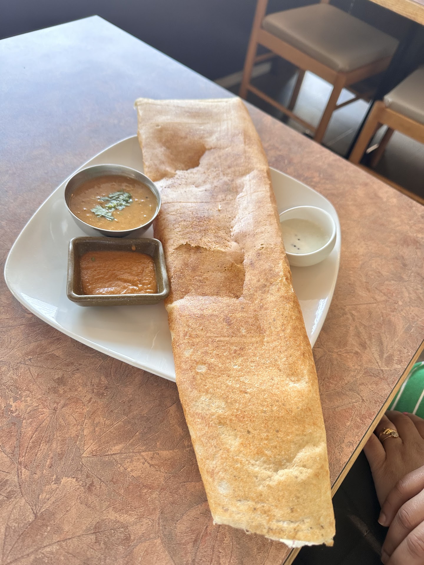 Very cold in the restaurant, didn’t take off my jacket. Smelled heavily of cleaning supplies. Was told a few things weren’t available on the menu after trying to order. Came for the dosas so we ordered spicy chicken dosas, beef curry dosas and a chicken curry with a long name that started with a V (not vindaloo). Heard the microwave go non stop, received our food, semi warm. The dosas were very big fresh made to order and large but not like the picture of a rolled up “burrito” looking meal so harder to eat but that was ok. The dosa tasted good, but it was mostly dosa not a lot of filling- but perhaps that’s normal. Everything else was semi warm, tasted of microwaved meat, chicken in the dosas were chewy and not a lot of it, mostly potato, beef was tiny chopped pieces of overcooked hard meat. Not the slow cooked fall apart beef we are used to at other local Indian food establishments. The curry was good but it was a small portion, it came with a homemade naan that wasn’t fully cooked and tasted of raw dough. Funny enough the beef curry and chicken curry didn’t say they were spicy and were spicier than the “spicy chicken” dosa. It has so much potential because a lot of flavours tasted ok but were not heated or old tasting with lazy skipped microwaved steps. That paired with uncooked dough are not cutting it. Perhaps a smaller menu would be better suited so more things were fresh, no need to rush and skip crucial steps! We tried to mention a few things to our waiter but there was a language barrier, he just nodded and said good good. Meanwhile a man in the back was on speaker phone and arguing with someone the entire time. We were the only ones in the restaurant. Won’t...