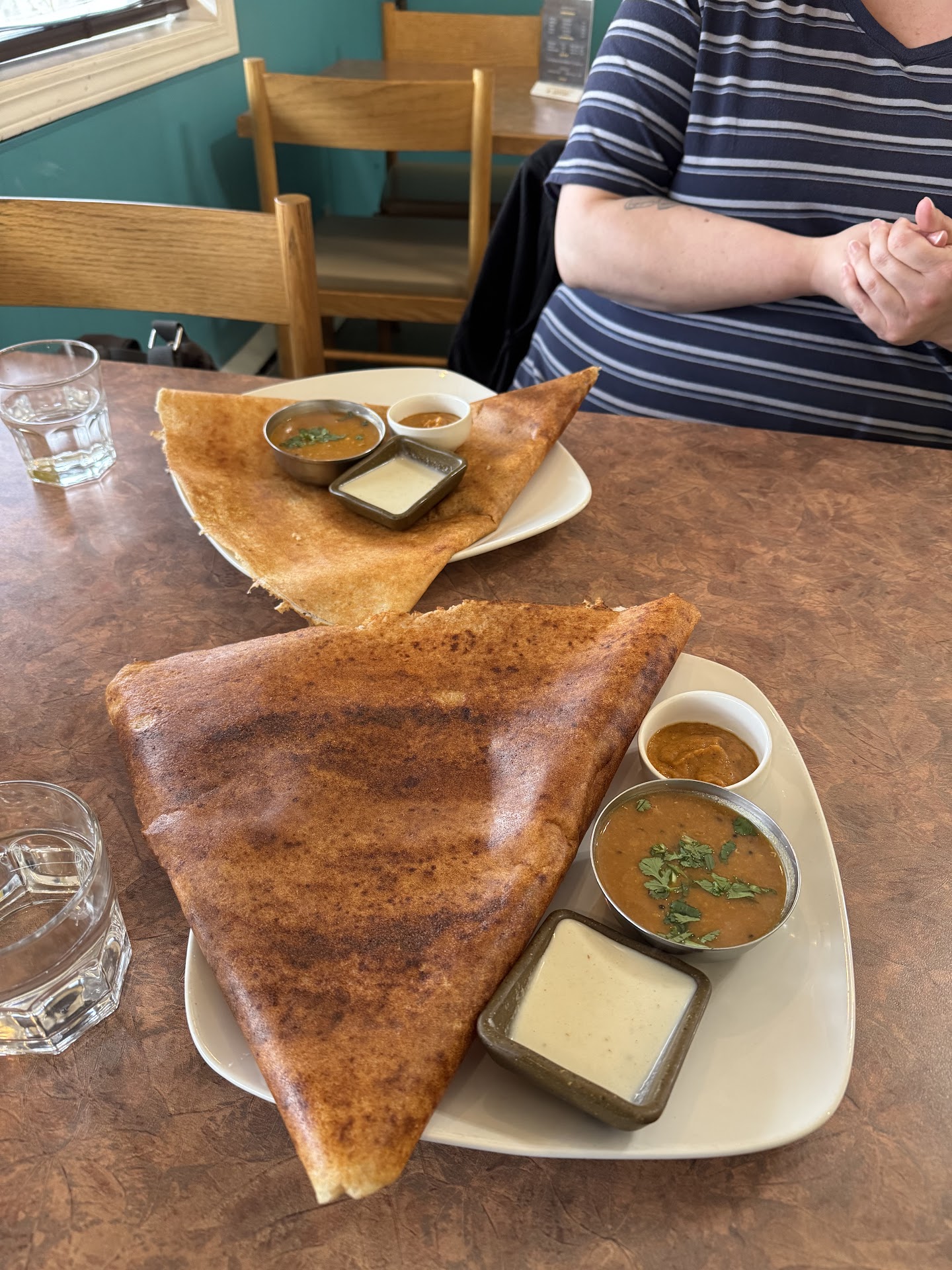 There's a big range of fillings available, and many options for gluten free and vegetarian diners. The dosas were crispy and the fillings.so flavourful. I love the soup that comes with each Dosa order. We went with a group of 6 and they did a good job trying to get the meals out at the same time, but the kitchen can probably only handle so many outgoing orders. I did go back another time for take out and while they were very tasty, I must say that the dosas are best had fresh and on site. Do yourself a favour and dine in for the...