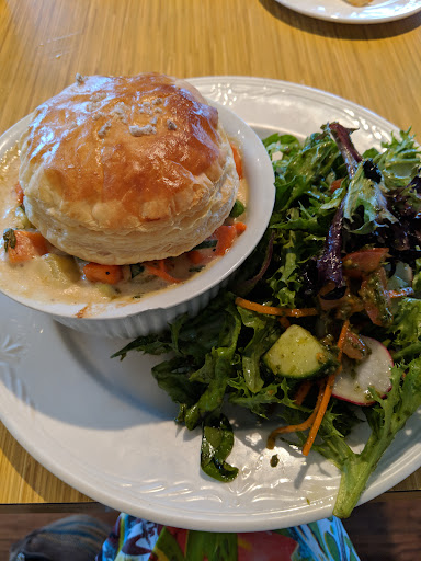 ORIGINAL: The food was absolutely delicious and the environment was very pleasant. The walls were covered in oldies music memorabilia which was pumping through the sound system as well. We had the garlic bread with marinara sauce and goat cheese crostini with fig jam for appetizers. These dishes came nicely for sharing, and the crostini was especially mouthwatering, even making me long for seconds. Even though we called ahead inquiring about vegetarian options and were assured there were plenty, there were only two vegetarian entrees on the menu. We both chose the pot pie with side salad; I asked if I could upcharge the salad to a specialty salad and was told no. The pot pie was very good, with more variety in the vegetable medley than a typical pot pie and a nice flaky crust. I was impressed with the food over all, however we definitely felt second to the take out diners who were constantly coming in and leaving with large orders. We even adressed the wait time for our entrees to the waitress and didn't receive much explanation despite the fact we could tell the take out customers were the priority. I am already thinking about when I can get my hands on that goat cheese crostini again, but maybe I'll...
