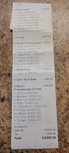 Read moreI was missing my drink and fries from my combo and when I called I was told the system is making errors and didn't charge the combo. Okay I understand but I still ordered and paid for root beer which is still not with my order and they said I didn't get a combo so they didn't add the drink and that I didn't pay for a rootbeer. The staff I spoke to were very rude and made me feel like it is my fault that the system glitches and still didn't get what I paid for as the root beer is on my receipt. As my teen was eating his burger he found a hair in his toppings and so did my husband so none of us wanted to continue eating. This was what $60 got us. Soggy fries, soggy onion rings, 3 burgers(two with hair) and 2 small gravy that all went to my compost bin. I definitely will not...