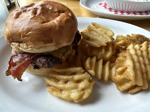 Beautiful building, great location, and maybe the only craft burger place in town. Upon arrival the patio was less than half full with plenty of empty tables. After waiting a couple of minutes we took a seat. When our server arrived she greeted us with a (fake) smile and a (rude) scolding, informing us that we should have went inside first, to be seated outside. The service got worse from there. We waited 35 minutes for a pint of beer, and eventually had to go inside to get it! No cutlery or napkins when the food arrived (we had to ask)!! Even after asking we were given one knife to share between the two of us. The condiment bottles were dirty, and consisted of only ketchup and mustard. No vinegar, malt vinegar, hot sauce, relish or anything "crafty" to be found. The food itself took 45 minutes (for 2 signature burgers). The french fries were simultaneously soggy and burnt - really bad taste. And the "She's a Brickhouse" burger I ordered consisted of paper thin slices of bacon that didn't taste smoked (the menu says smoked), soggy onions (the menu says crispy onions), and cheese that did not taste like cheddar .. more like jack. Unfortunately these were average burgers at best. Certainly not "craft" quality. Please take this as constructive criticism and fix things. Because we really want to love the BrickHouse, and Peterborough does need a quality burger establishment downtown.