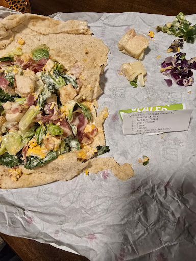 While the girl was making my pita there was spilt ranch on the area where they prepare the pitas and she picked it up with her gloves and then proceeded to look to see if others were watching then she wiped it on her apron. I had fuzzies in my pita due to this which was disgusting!