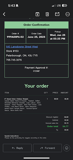 To make matters worse, the order I placed through the app was prepped well before the app indicated, resulting in a cold, soggy mess of a sandwich. It was hands down the worst Subway experience I've ever had. I used to prefer ordering directly at the store, but after this fiasco, I'll never trust their app again.