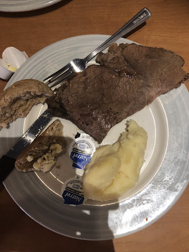 Beef was cold and dry, tasted like hospital food ask for no vegetables and no horseradish and gravy. Didn’t offer anything else in replacement for vegs.