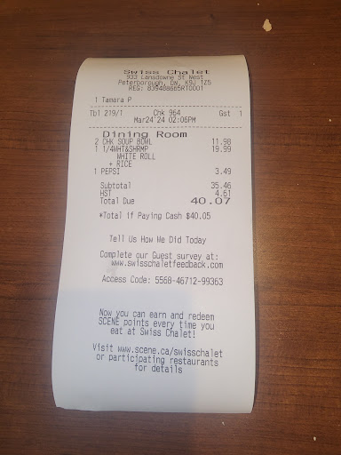 Read moreWe got here at a little before 5:30pm and requested a booth to sit in. The host said that service is a little slow at the one booth that was open, but we were okay with that as we had a 4 yr. old grand daughter with us who needs extra room to move around. "Service being slow" was indeed an under statement, it was nearly 1/2 hr. before the waitress even came over to take our order. And more than 15 minutes after that before we got our drinks. And we had a now cranky and hungry 4 yr. old who hadn't been fed yet. But the kicker for me was when I saw people who got seated near us 1/2 HOUR after we were seated....get their dinner before we did.....and we had ordered 30 minutes before them. The waitress seen I was mad and came over, she blamed it on the kitchen. The food finally arrived 10 minutes after that.....So an hour and half to get dinner and 2 hours total in there. I'm in my 60's and have dined out all my life at restaurants. The service here was the worst. I will be going to north-end Swiss Chalet from now on. And I fully expect this review will get me a AI generated apology reply from Swiss Chalet that will be meaningless.