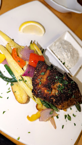 The blackened salmon entrĂŠe was perhaps the most visually stunning of the three items. Served atop a vibrant bed of vegetables and paired with a lemon wedge, the dish looked promising. The salmon had a beautiful crust and was cooked to perfectionâcrispy on the outside and juicy on the inside. However, much like the calamari, it lacked a punch of flavor. A more robust blend of blackening spices could have made this dish exceptional. The accompanying vegetables were fresh and colorful but needed a touch more seasoning to make them stand out. The creamy sauce on the side was delightful, providing a much-needed flavor boost to the dish.