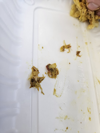 Went here today (November 9, 2024) and got a curry chicken roti. The first bite was filled with bones. Second bite, more bones. There were both slivers and chunks of bone. When I went back to tell the worker and ask for a refund he told me they don't do refunds and that "it's just small slivers". Again I asked for a refund and he said no and offered to remake it, and he ensured me he would pick out all the bones. When my husband tried the new roti the first bites yet again had more bones that were even bigger chunks. I didn't take photos of the first roti, but I did of the second. These were the bones in just the first bite.