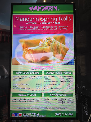 Read moreThis is the first time we came to this pickering location, and we came across the senior day, it's really busy there. Atmosphere and the service is great, many kinds of different food for everyone, like any other experiences we had at Mandarin. And surprisingly they have sashimi and roasted beef for lunch! However, for the food part, I have some honest thoughts comparing with other Mandarin locations 🤔 The fried chicken wings and shrimp is kind of grease, not crispy at all, by the look its kind of a bit brownish instead of golden. I had good chicken wings in other Mandarin locations. The mashed potato is very cloudy, really needs to work on the texture! The Shanghai noodles is over cooked, I'm thinking the cooking method was not right, it's definitely needs more oil to coat the noodles to prevent it getting very soft and less presentable from being in the buffet tray. Maybe is a new cook today, definitely needs more training. The sour and spicy soup, a bit disappointed, this is one of my favorite at Mandarin. The taste is more to the sour part, needs to balance with the spicy part. Also, the carrots is cut in Big pieces and very hard insteadof soft and small piece for presentation, same as the tofu curd is cut in big pieces, which is not practical for the soup. As well as the consistency of the soup is too thick, seems too much corn starch. I'm comparing this soup with other Mandarin restaurants, it could be they twist the tast to fit in the community. Other Mandarin locations they have the garlic green beans and some sort of eggplant dishe. At this Pickering location they have none of the two! Very disappointed! My family loves those vegetable dishes! Overall, my family is a big Mandarin fans for many years! I give honest reviews to help Mandarin maintain excellent quality and looking forward to come back again. It was very touched too see Mandarin having this Senior appreciation day! I like the way Mandarin is giving back and support to each customers with their age range! Way too go,...