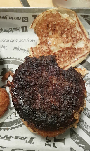 Now I always order a burger well done well my burger came sitting on a piece of lettuce swimming on grease like no body has ever seen. The gravy on my poutine was chunky and thick and I couldn’t get the salt out of my mouth. That all being said after having two bites I can guarantee 100 percent that I was not eating a works burger patty that thing tasted like a frozen patty from the grocery store ( keep in mind I come twice a month to this place) I know my patties. And it was also “pink” not well done I did not finish another bite