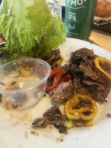 Over to my husbands burger now also supposed to be well done this burger was leaking grease out of every side and when he took a bite it was covered in an excess of hot peppers. The meat looked like ground up dog food and he was supposed to to have the “waygu” after trying a bite without the hot pepper he was so turned off it was bad meat. I wish I had gotten a pic of the inside of his burger but I was so disappointed I was already checked out. He did not take another bite after that. I can tell u that night around 3am he was hugging the toilet bowl and I am not surprised. something is going on there food is not being handled properly or has been changed from the franchise standards. I hope that no one else has to experience this. I have never left a bite on my plate and this is how I left...
