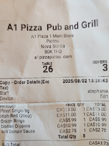 Read moreTrying for the first time, although there was no answer when I called to order, finally decided to drive down, went to the takeout window and after placing the order was told wait time of 40 mins, I gotta say the food was absolutely DELICIOUS and I received the order in just 20 mins. It was still hot when I got home 10 mins later which tells me the food was not just sitting and was prepared fresh off the stove. Donair, Fish and Chips and Chicken Shawarma platter with fries is a MUST try. 2 Staff members I dealt with were friendly and professional. Thank you Team!! ...... now THAT'S what I call ...... A1 food A1 service from A1 Pizza!! KUDOS!! 🤓