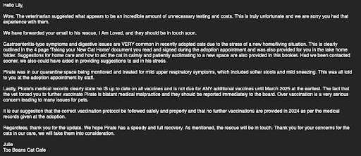 After informing them of Orion's hospital stay and what happened, Toe Beans made the choice to tell me that the tests/diagnostics the vet did were unnecessary and that I should've just called them if I was having concerns about Orion's health. They are NOT a veterinary clinic. They also made the choice to assume the vets were incorrect about the improper vaccinations and tried to frame that as the vets trying to get more money out of me, I confirmed with 2 different vets that Orion was incorrectly vaccinated according to the records I received at his adoption and that he would need to be restarted on the vaccination schedule.