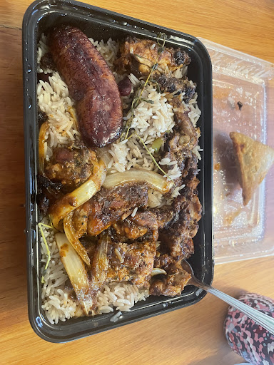 Pictured is the traditional jerk chicken. I also ordered veg samosas. The jerk chicken was very good as were the samosas and plantain included with the jerk chicken. However, the rice was bland and it had red kidney beans in it instead of peas. The description on the website said peas as did the woman on the phone who took my order. It was fine for me to have it with kidney beans but my friend is allergic and could not have any of the food we intended to share.