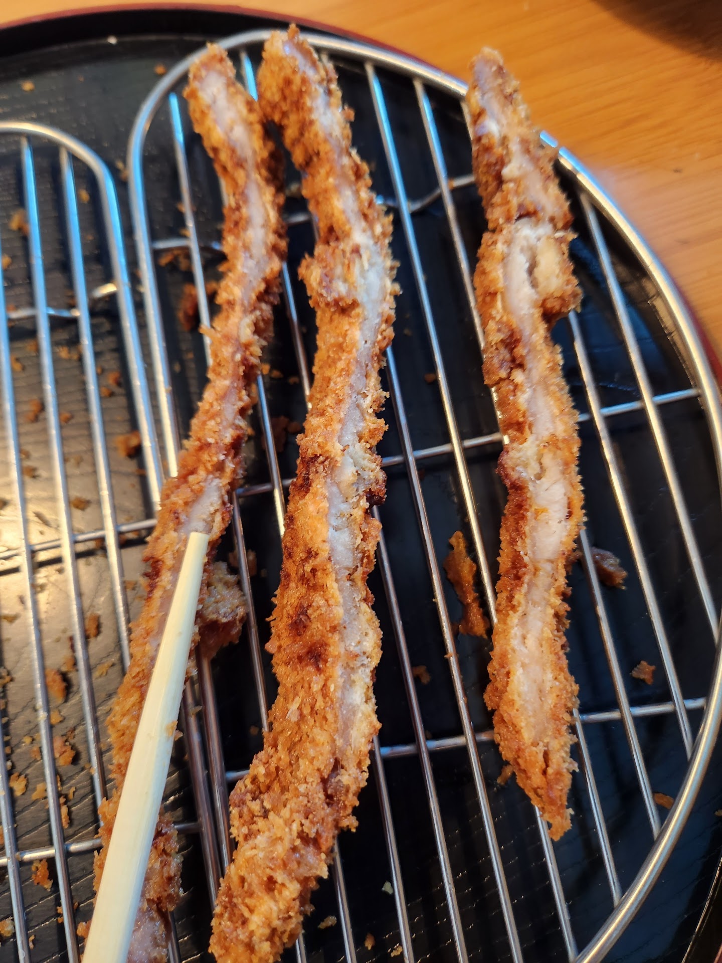 That's not how tonkatsu should be. It should be thick and juicy and soft on the inside with a nice soft crunch on the outside. The saving grace for me was the sauce helped me digest it.