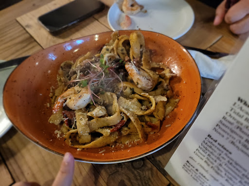 Read moreTried here for lunch on a sunny Friday in January and glad I did. There are a couple of parking spaces out front, which we got right outside the door, so didn't take notice of there was a lot in the back or anything. When you enter, there are a couple of wooden tables in the middle of the space, with seating for 6 each? To your left, there are smaller tables/bench space for 2 or 4, a few window seats, and one small, more private booth in the back. Casual rustic atmosphere with lots of natural lighting coming in. Large chalkboard menu, with laminated printed menus at the tables as well. Very friendly staff, especially from our purple-haired female server! Re the food: I wanted to try two of the small dishes, to experience two vs one menu item, but ended up picking the daily Ravioli special ($11) which was very good. Five homemade raviolis stuffed with quark cheese, topped with maple caramelized onion, which gave the dish a sweetness to offset the richness that ravioli normally brings. I was full before I finished it, and hadn't eaten all of the bread that came with it. (An orange colored, fresh, thick, almost focaccia...not sure if it was squash based or what, but tons of flavor in the seasoning). My friend ordered their spaghetti (with roasted red pepper, tomato and meat sauce. $11) but requested it with tagliatelle noodles instead, which was no problem. He was definitely satisfied with the flavor and portion size. Most of all, if you compare here to a "finer" Italian restaurant in Halifax, the food is just as good, but the price is less. I will definitely be back to try the rest of the menu, including their Asian dishes, etc. FYI: small, but decent selection of alcohol. My glass of Avondale Sky Tidal Bay hit the spot. His stout (that I forget the name)...