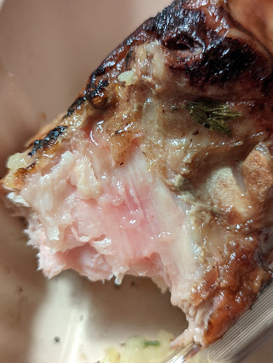 Read moreI came here once several months ago and I really quite liked it. However, today's visit was quite disappointing. I had a reservation for 6:00 for 4 people - myself, my parents, and my young daughter. We arrived about 5 minutes early and were sat right away. However, no one came to our table for about 20 minutes, the waters we requested for our outdoor table in the heat were forgotten completely until we asked again (about 40 minutes in), and it was about an hour and 15 minutes after we sat down before we got our food. My dad's appetizer was served at the same time as his dinner, so his pasta was cold by the time he got to it. We got no warning about my daughter's super hot plate, which gave her quite a surprise when she touched it. My food was delicious at first - I ordered the pork chop, which was very tender and tasted great, but was too big to eat in one sitting. I took it to go and just decided to have a few more bites a little while ago, but after cutting into it I see that much of what I didn't eat at the restaurant is uncooked. I'm ok with a bit of pink in my pork, but not raw.