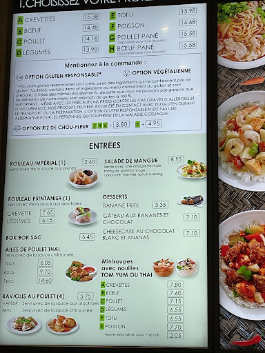 Got the general thai bowl combo, chicken was soggy, paid extra for veggies and got 6 slices of bell peppers and 2 little broccolis for 4$. When at the cash, i had a 10% rebate, although the coupon said purchase a combo and you receive 10% off your meal, he applied the 10% on the extra veggies only. Mentionned it to him in french and didnt seem to understand, so i tried english and still was clueless. This is actually the second time i have bad experience there. Will reconsider before going back there! Note that i paid 26$ for a bowl, tiny spring roll and 7up can ( including the rebate)...