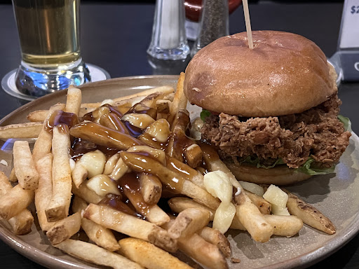 The clientele isn’t always the best and I had a strange interaction in the bathroom. BUT, the chicken burger was actually the crunchiest fried chicken burger I think i’ve ever had and yet juicy inside! Simple additions to the sandwich, just a couple pickles and tomatoes and a slice of lettuce with mayo. Honest truth if every chicken burger was this good i’d give up beef burgers when eating out. Thanks Lulu’s (Ps poutine was...
