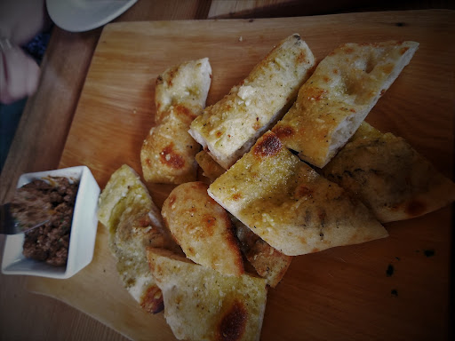 Two friends ordered beer while extolling the quality of the Crossroads brand. They never leave without picking up growlers. I don’t drink beer, believing it a joke passed on from the Sumerians to the rest of time. I found one brand at Crossroads that didn’t make me vomit, and that’s as high a praise you are ever going to get. It was called the Mother Heffer, which I couldn’t help thinking sounded dirty. As for the food, we opened with the share platter, a spotlight of all the other snacks, including olives, beer nuts, stuffed dates, flat bread, and biltong (South African jerky). Although all fantastic, high points go to the dates and flat bread.