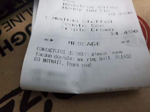 Chose contactless delivery option and prepaid on the website and left a clear message (1st photo). Receipt shows Pizzahut's own instruction as well (2nd photo). In the year of tail-end of the pandemic, the delivery person kept waiting for me. Seems like they had a poor grasp of English. That's fine, but training should have included this basic contactless delivery option.