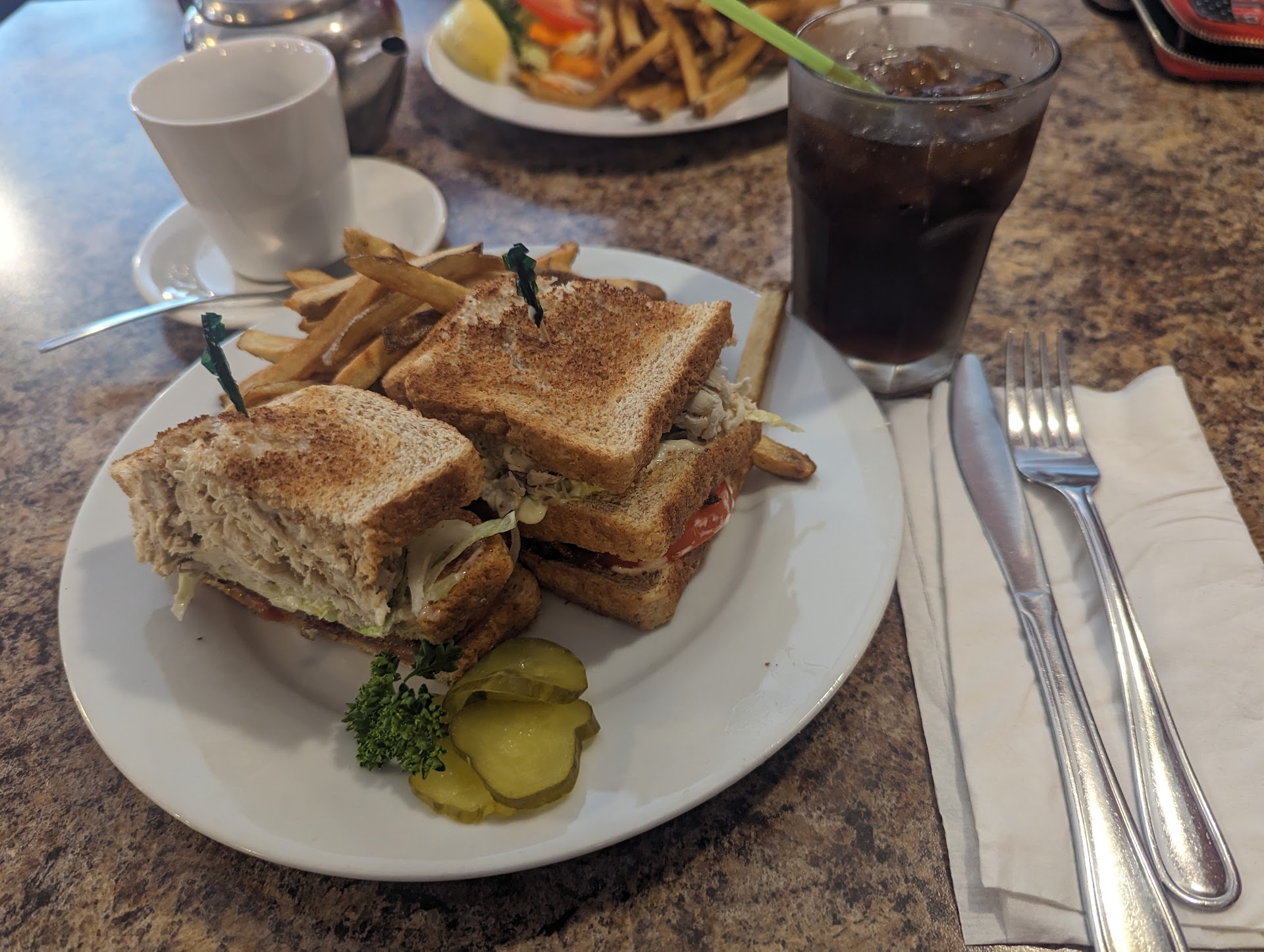 Read moreI found the place overhyped.The only reason to go there was that we wanted to sit in the patio as we had a puppy with us.I wanted to have medicine before food so I literally requested water bottle more than 3 times to a server.Twice i went inside to remind them we are sitting outside and ready to order. We ordered couple of items and also ordered a black coffee and a cappuccino.I told the female server 3 times for sugar still didn’t get it.There was no sugar in my coffee. Service very poor and slow. The restaurant had tables inside but if there is a customer table outside it should not be neglected.We had kids and puppy so we expected the prompt service from this restaurant. The fish and chips were average and the fries were not crisp at all. The portion size of sweet and spicy prawns was very small. I have had much better chowder in Vancouver and Seattle so there was nothing special about it.Too runny no creaminess. I think this place is pretty old and have a food legacy but need to upgrade its...