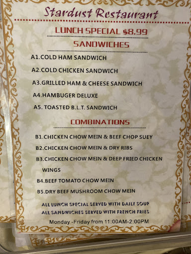 Read moreI found Stardust to be a busy place , in a wonderful way . I was lucky enough to be there when there was a social gathering of friends on the 1 side of restaurant , while I waited for my take out .The women at 1 table , the men at another .The women , were most elegant dressed to the nines . Happy , and all the kids dressed in their best .Sharp looking bunch . All smiling have a great night out ,kids being kids .It was spectacular . The hosts ( owners or management ) were never to busy to make you feel warm and welcome , food was excellent .Great spit , super people . I'll go once a week , great service , great place .very...