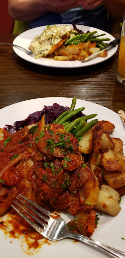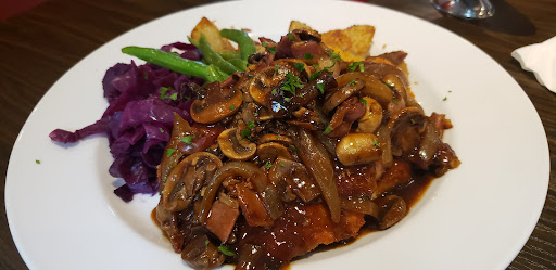 Read more4.5 stars here easy. an unexpected and delicious meal. found the Black Bird Schnitzel Haus on Google maps during our recent visit to the island and decided to check it out. fun, slightly kitschy German "haus" atmosphere with steins, tapestries, and photos creating the scene. we did not have a reservation on this Saturday night but we were seated at a table on the patio with no delay. even close to the highway the outdoor seating was excellent on a sunny evening. perusing the menu, there were about ten app choices including a tomato salad and a cucumber salad, both served on a bed of lettuce. what caught our eye was the option to have a combination of the two. so that's what we ordered. bright crisp veggies-including some sweet onion-with an herby vinaigrette. delicious. besides the obvious choice of schnitzel, the menu has a few other German style dishes-spaetzles, etc-but surprisingly there are asian style stir fry entrees, all with sweet chili sauce. we chose to try and pick between the 24 (!!!) different styles of schnitzel on offer here. some traditional and some decidedly not. like the Thai Prawns, Apple Blackberry, and Bacon with Maple Cream Sauce. They did all sound mouth watering though. my DW chose to go slightly more traditional with Schnitzel topped with Caramelized Onions and Apples. all the schnitzels come with Red Cabbage, Veggies-green beans on our visit-and choice of German Fried Potatoes or Spaetzle. she chose the potatoes and pronounced them and the whole dish delicious. very particular about her beans, they passed muster, and the potatoes were significantly better than the spaetzle i chose which mo was the only misstep of the meal. combination of onion and apple on top of the thin filet of fried pork is very very tasty. i went more untraditional with my choice of the topping of bacon wrapped scallops and hollandaise sauce covering my pork. having recently ordered bacon wrapped scallops elsewhere and being disappointed, another try was in order. this combo was a flavor revelation. plump scallops wrapped with perfect texture bacon and lemony hollandaise i assume was made in house. i made the decision-a good one-to ask for a small side of extra sauce to accompany the dish. perfect to ensure i had some for the entire meal. it was a wonderful with the schnitzel. can't recommend this dish enough. if you enjoy any of the parts, the whole is outstanding. we look forward to making this a regular stop on our trips to the island, regardless of the distance. do not miss it if you have any interest in German cooking. highly...