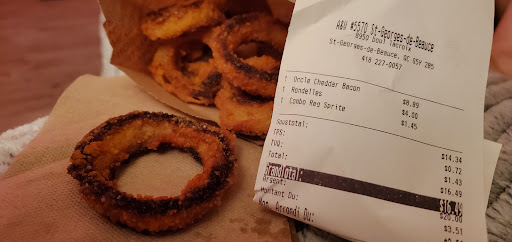 A la base j'ai demander un oncle Burger pis un nashville frite changer en poutine rendue chez moi je me rend compte que j'ai deux oncle Burger ce n'est pas une grosse erreur mais pour 40 min de route deux Burger une frite en poutine pour 30.22$ a ce prix la on veut surtout pas erreur il a Ă©tĂ© trĂšs gentil malgrĂ© mon manque total de calme il a Ă©tĂ© trĂšs polis et il m'a mĂȘme rapeller pcq j'avais Ă©courtĂ©e l'appelle il a pris mon nom tel et n'importe quand je passe et j'aurai une item gratuit ses rare d'avoir un bon employĂ© comme ça...