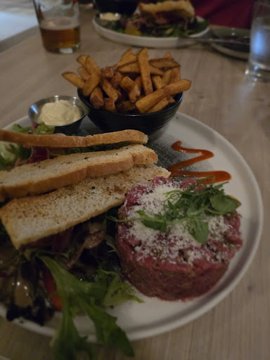 The homemade boudin and steak tartare were particularly delightful. Our order consisted of two tartares, one boudin, and two beverages, and the total, inclusive of gratuity, amounted to 101, which seemed quite reasonable considering the quality of the fare.