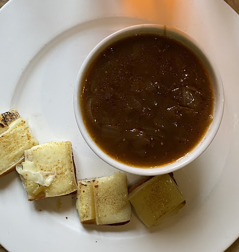 French onion soup, the broth was phenomenal but I am old school, I guess because I prefer the croutons and cheese composed in the dish rather than decomposed, which this is.