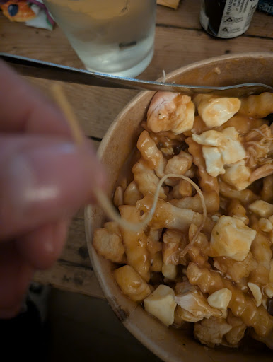 La caissière a regardé le ciel en soupirant quand elle a vue que je ne donnais pas de pourboire et bon ce n'es peu être pas lié mais quand même un drôle de hasard je retrouve de la corde de poulet dans ma poutine ce qui est très dangeureux de s'étouffer
