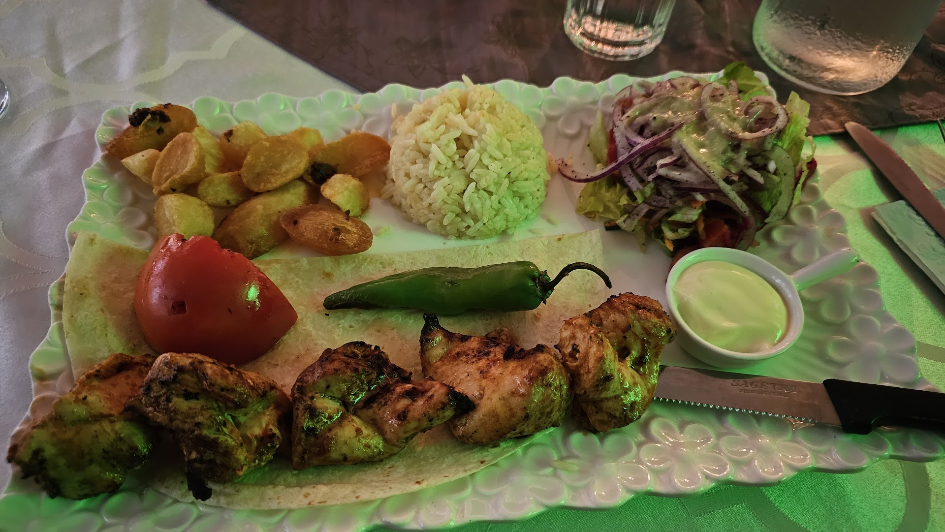 So, yeah. Don't be a guest in this wonderful city and be treated like this. You deserve better! By the way, the food was average, at best. Picture below. This should cost half of what it does. The potatoes were rock hard. The salad was insultingly small. The entire middle of the plate has one green chili. Initially, I thought it was some sort of joke. The 'pizza' (not pictured) was even worse. Calling this 'Turkish' is an insult to that cuisine. Please spend your money elsewhere and trust the...