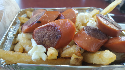 on commence à déguster nos poutine Pepsi aussi pétillant que l’eau qui sort de mon robinet et goute pas tres bon Eau même chose mais c’est normal c’est l’eau de Québec c’est pas la meilleure eau ! Dulton saucisse : saucisses aucunement grillée et viande fade sans saveur Frites excellente et fromage aussi