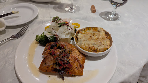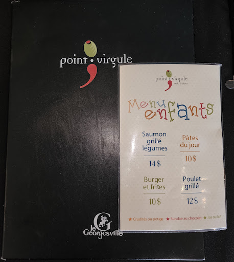 Nous avons passé une très belle soirée au restaurant Le Point-Virgule, au rez-de-chaussée de l'hôtel Georgesville, à Saint-Georges. Le service était très attentionné et professionnel, l'endroit est élégant, et les plats, savoureux. Nous avons pris en entrée la salade jardinière et le potage du jour (courgettes et pommes de terre). Comme plats principaux, nous avons pris le pavé de saumon, le ravioli à la courge et le Penne trois fromages. Bon choix de vins français, italiens, californiens, etc. Plusieurs plats sont végétariens (Ravioli à la courge, penne trois fromages, salade gourmande ainsi que plusieurs entrées tels que la soupe à l'oignon et l'antipasti), et le sympathique personnel nous a offert d'adapter plusieurs plats en formule végétarienne ou végane si nous le désirions. Stationnement facile, 2 bornes de recharge pour véhicules électriques à l'arrière (mais souvent occupées). Somme toute, une très belle soirée,...