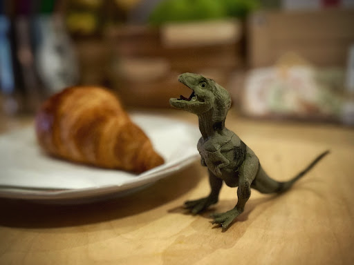 Just as I was savoring my drink, the door swung open, and in walked a very handsome T-Rex. He greeted me with a friendly nod and made his way to my table. We order two golden, buttery croissants. Despite his intimidating appearance, he had a gentle demeanor and a keen interest in sharing breakfast.