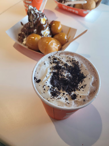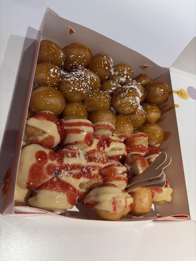 Les puffs eux-mêmes sont absolument délicieux. Croustillants à l’extérieur et incroyablement moelleux à l’intérieur, ils fondent littéralement dans la bouche. Leur fraîcheur est incomparable puisque tout est préparé à la commande, ce qui fait une énorme différence par rapport à d’autres desserts. J’ai particulièrement adoré le chocolat noisettes et le caramel salé, mais honnêtement chaque saveur mérite d’être essayée. Ce qui est génial, c’est la variété : on peut personnaliser nos puffs avec différentes garnitures et sauces, ce qui rend chaque visite unique.