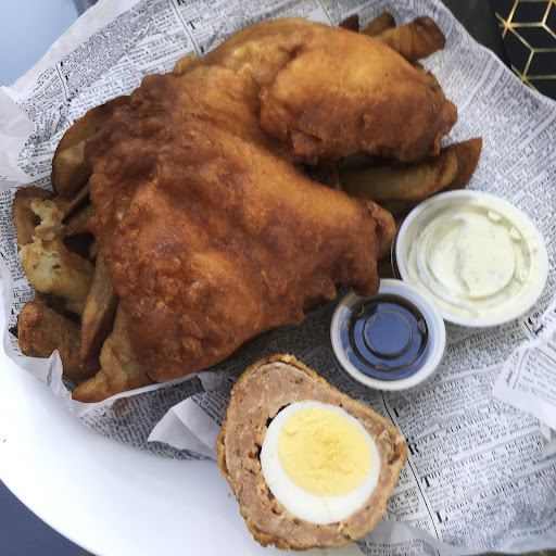 Very professional and friendly staff. Requested suggestions on how best to reheat take out fish and chips and was given easy detailed advice from Phil. We've eaten fish and chips pretty much all over Canada, England, and elsewhere. Phil's fish and chips were simply delicious (We had haddock and cod). Tender fish with crispy batter, the chips were better than we thought they would be, with malt vinegar (malt, so pleased). The dessert (carrés aux dates avec caramel is the french translation for sticky Toffee pudding which was so delicious it brought back memories of England to my wife. The Scotch egg was as tasty as can be, as was the deep fried mars bar. Overall, being locals, definitely will be making repeated visits when in the area(which sadly is not to often, but will have to start finding excuses). For visitors, it may appear a little out of the way, but it's not. The staff are fully bilingual, and the food is simply amazing. If you are looking for authentic British fish and chips, look no further, this place would be very hard to beat. Note- I was there for take out, but the restaurant, though a little small, was very clean, with nice seating, and again, a friendly staff. Though I would be tempted to suggest ordering take out and having your meal at Quai Cageux along les promenades Samuel de Champlain which it is not to far...