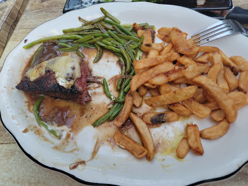 J’ai commandé une bavette de bœuf demandée medium saignante. Ce que j’ai reçu, c’est une pièce trop cuite, sèche et caoutchouteuse au point de ressembler à un chewing-gum. Pour un plat affiché à 42$, on s’attend à un minimum de qualité. Au lieu de cela, l’assiette se composait de frites bas de gamme, de haricots sans goût et d’une sauce aussi insipide qu’inutile.