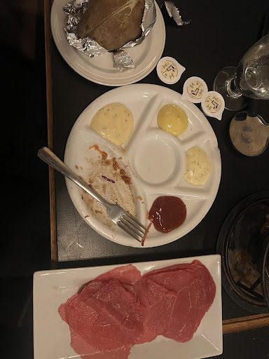 Moving on to the main course, the fondue pot and heating apparatus were outdated, preventing the fondue stock from boiling and consequently hindering the cooking of the meat. The fondue was served with a warm, not hot, baked potato containing a single, packaged square of butter, a microscopic green salad, and a small amount of dipping sauce.