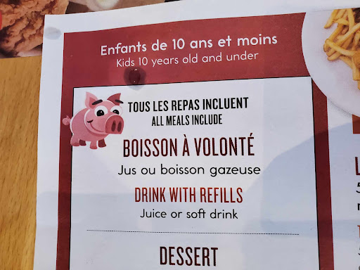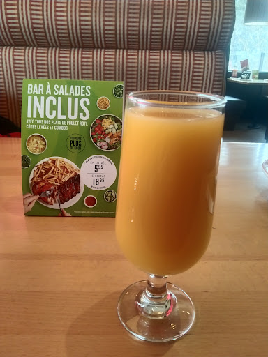 Read moreGrosse déception suite à notre visite un peu plus tôt cette semaine. En regardant le menu pour enfant, ma fille voit boisson à volonté. Elle me demande donc si elle va avoir du jus autant qu'elle le veut. Je lis la phrase sur le menu, avec mon conjoint, et on lui confirme que oui elle aura du jus à volonté. Quand on a demandé le refill à notre serveuse, elle nous a dit que c'était seulement pour les boissons gazeuses. On lui montre le menu qui dit très clairement que ce sont les boissons a volonté et elle nous repond que ce sont seulement les boissons en fontaine, que le prix des jus est beaucoup plus élevé et que si on en veut un autre on va devoir payer. Impossible pour nous de savoir cette information. Ma fille était très déçue, avoir su elle aurait étiré son breuvage sur toute la durée du repas. Il me semble que ça aurait été la moindre des choses qu'elle lui redonne un verre et on lui aurait dit qu'elle n'en aurait pas d'autre après celui là, elle aurait très bien compris. On lui a dit de soulever ce point à son gérant et elle nous a répondu qu'il ne pourrait rien faire, que ce n'est pas lui qui imprime...