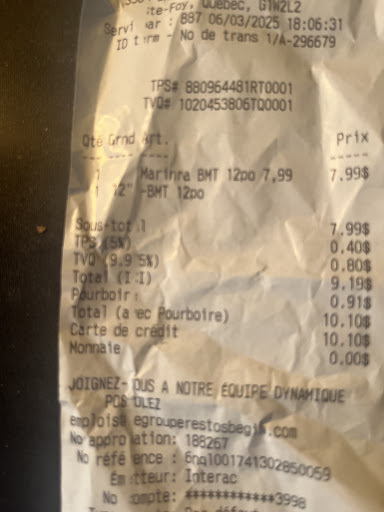 Vendredi midi le 6 décembre. Je me présente au comptoir et Pierre est seul, car sa collègue prend sa pause (c’est bien correct). Pierre sert trois clients avant moi, c’est long (environ 15 mins). Pendant ce temps, sa collègue termine sa pause. Elle commence à préparer mon sandwich, mais Pierre lui dit qu’ils doivent faire deux commandes en ligne. La dame ne trouve pas la deuxième commande (pendant ce temps, j’attends). Alors Pierre et elle commencent à s’engueuler (devant moi) en lui disant qu’elle ne comprend jamais quand elle lui parle et elle lui ordonne de poursuivre mon sandwich. Ce qu’il fait pendant 30 secs, avant de recommencer à se chicaner ensemble. Elle lui redit de terminer ma commande. Il revient. Il repart pour continuer la chicane. Elle lui ordonne de revenir finir ma commande. BREF. Ce fut grandement malaisant et j’ai été servie après 20 mins. Je crois que le Subway à Cap-Rouge et l’autre sur Chemin Ste-Foy (coin Duplessis) seront mes prochaines...