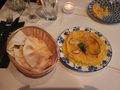 Le hummous était peu goûteux, avec une texture de pommes de terre pilées qui manque d'onctuosité. Le babaganoush était ok, sans plus. Les falafels étaient bons et croquants mais le prix un peu élevé pour le contenu de l'assiette. Les pains pita qui accompagnaient les falafels étaient identiques à ceux du Adonis.